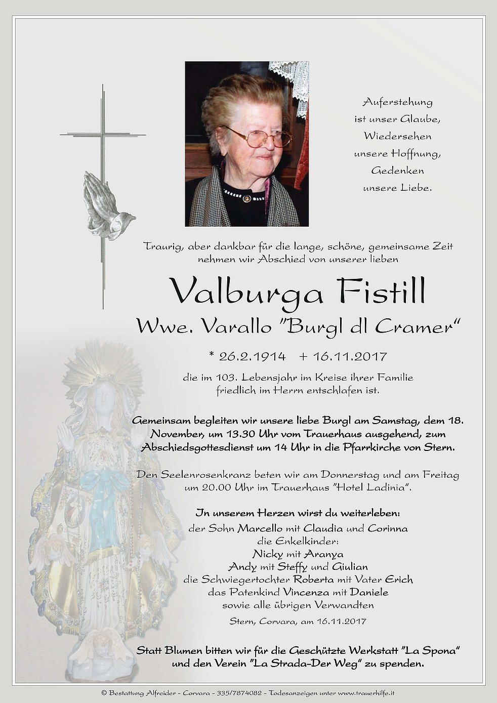 Den Seelenrosenkranz beten wir am Donnerstag und am Freitag um 20.00 Uhr im Trauerhaus ”Hotel Ladinia“.
