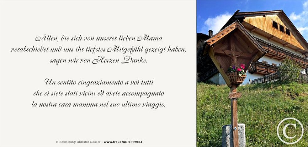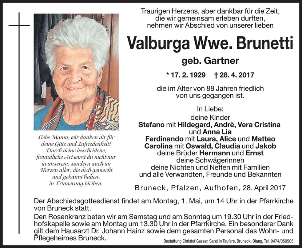 Ein besonderer Dank gilt dem Hausarzt Dr. Johann Hainz sowie dem gesamten Personal des Wohn- und Pflegeheimes Bruneck.