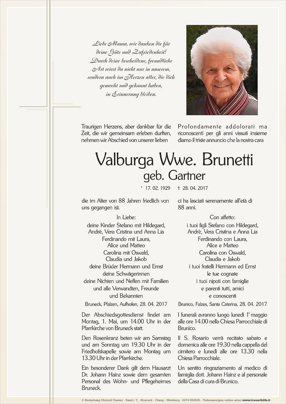 Der Abschiedsgottesdienst findet am Montag, 1. Mai, um 14.00 Uhr in der Pfarrkirche von Bruneck statt.