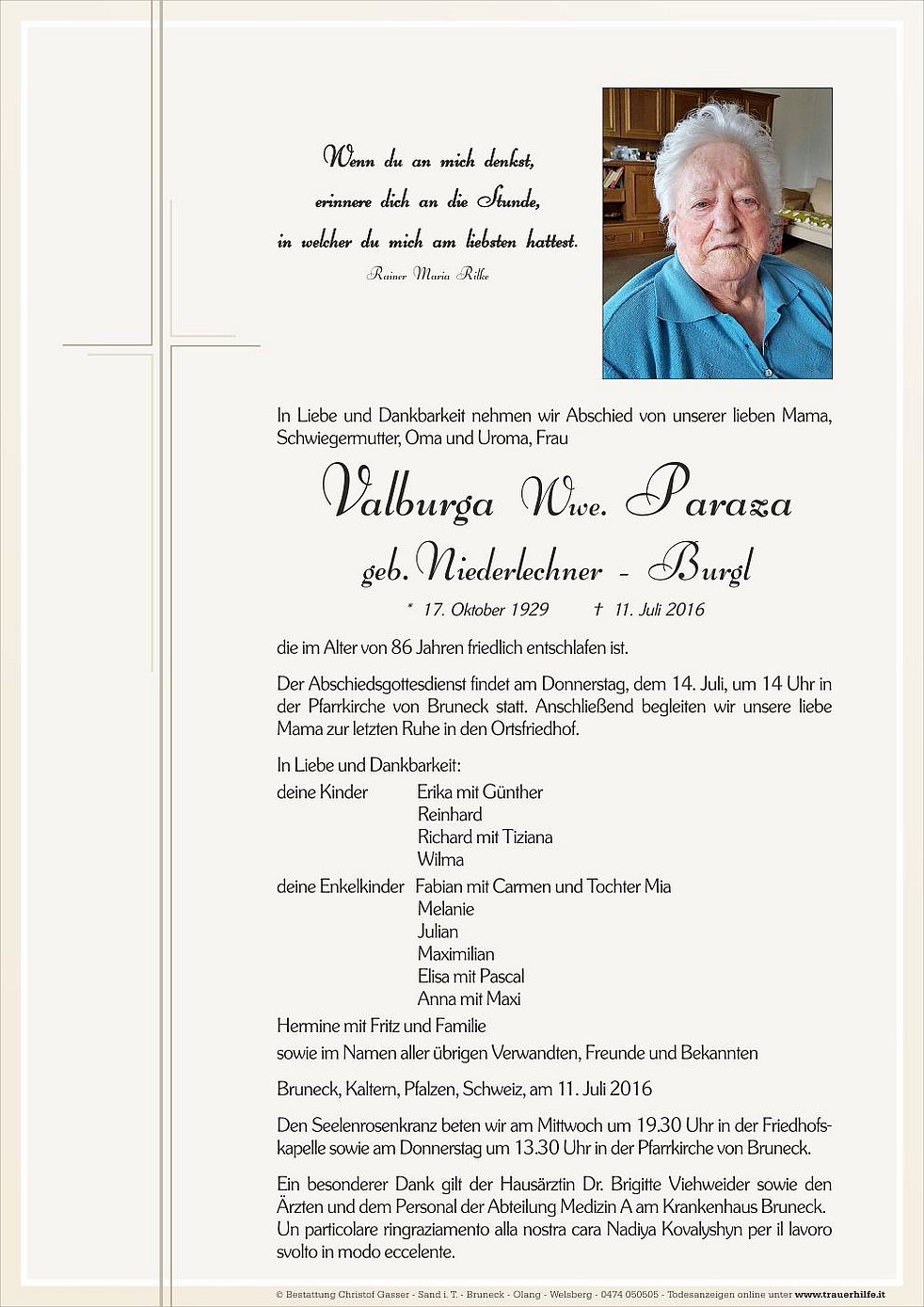Der Abschiedsgottesdienst findet am Donnerstag, dem 14. Juli, um 14 Uhr in der Pfarrkirche von Bruneck statt. Anschließend begleiten wir unsere liebe Mama zur letzten Ruhe in den Ortsfriedhof.