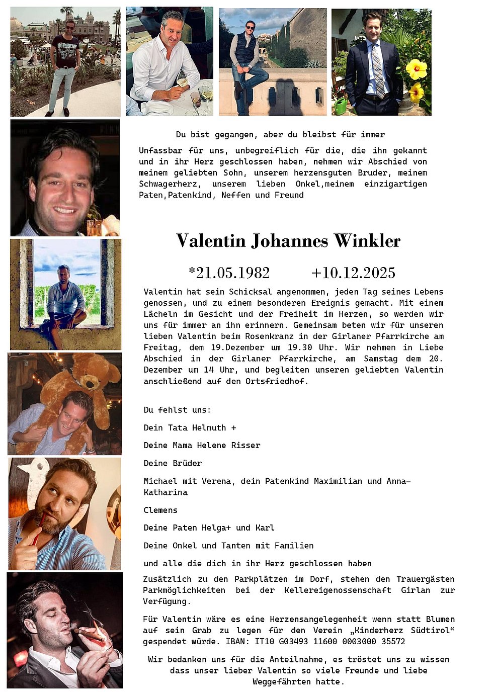 Für Valentin wäre es eine Herzensangelegenheit wenn statt Blumen auf sein Grab zu legen für den Verein "Kinderherz Südtirol" gespendet würde. IBAN: IT10 G03493 11600 0003000 35572
