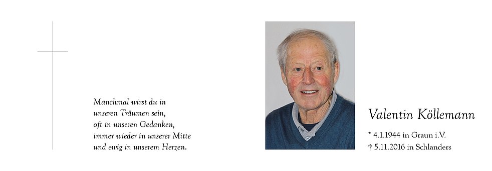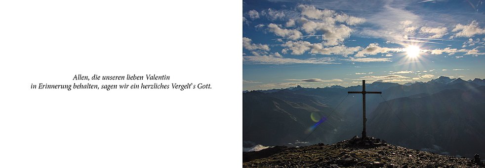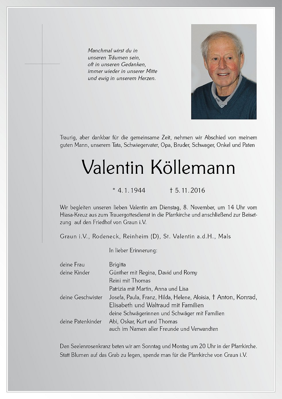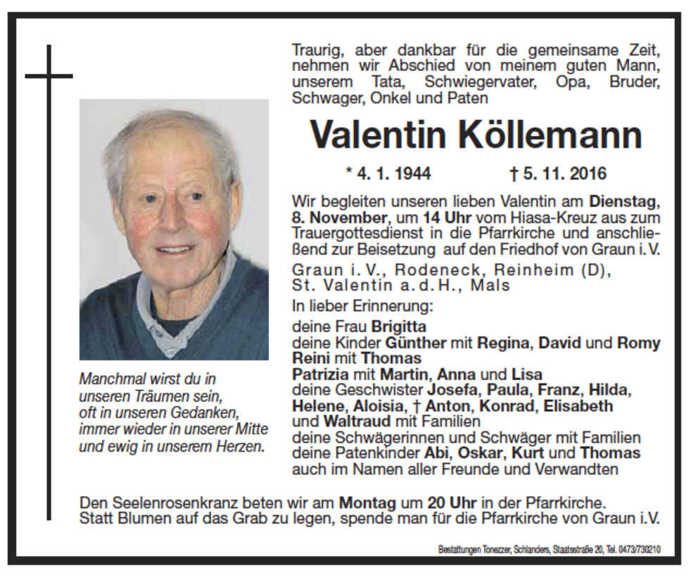 Wir begleiten unseren lieben Valentin am Dienstag, 8. November, um 14 Uhr vom Hiasa-Kreuz aus zum Trauergottesdienst in die Pfarrkirche und anschließend zur Beisetzung auf den Friedhof von Graun i.V.