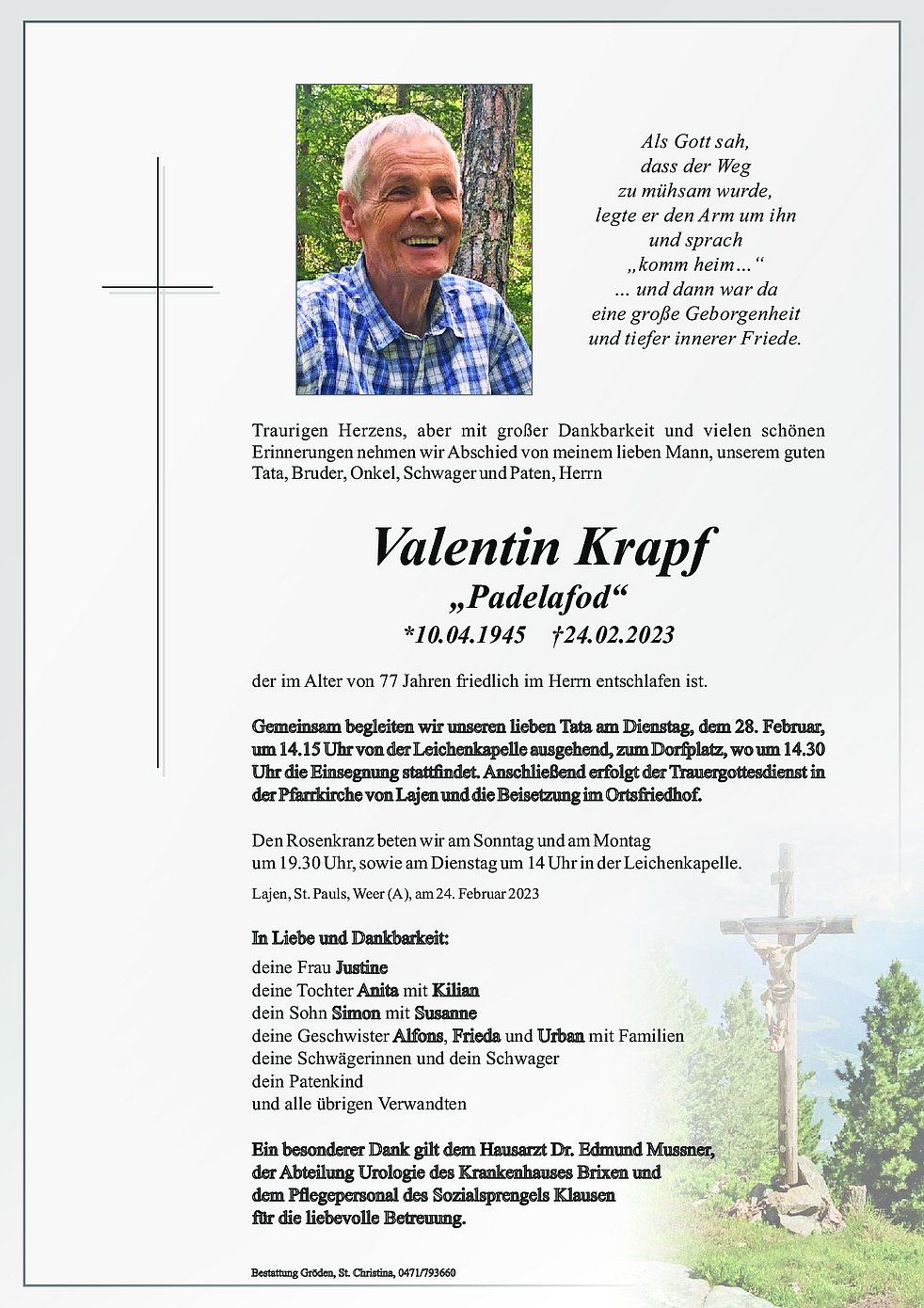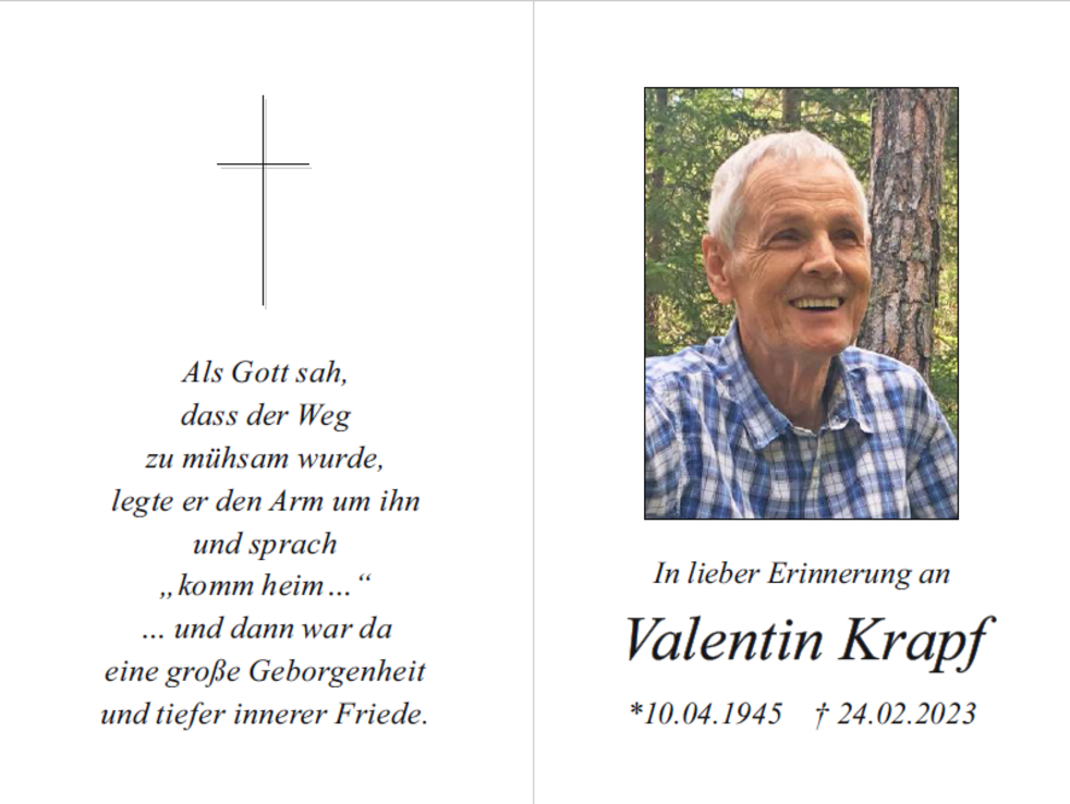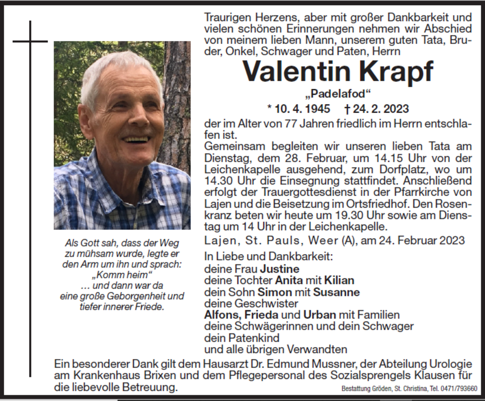 Gemeinsam begleiten wir unseren lieben Tata am Dienstag, dem 28. Februar, um 14.15 Uhr von der Leichenkapelle ausgehend, zum Dorfplatz, wo um 14.30 Uhr die Einsegnung stattfindet.