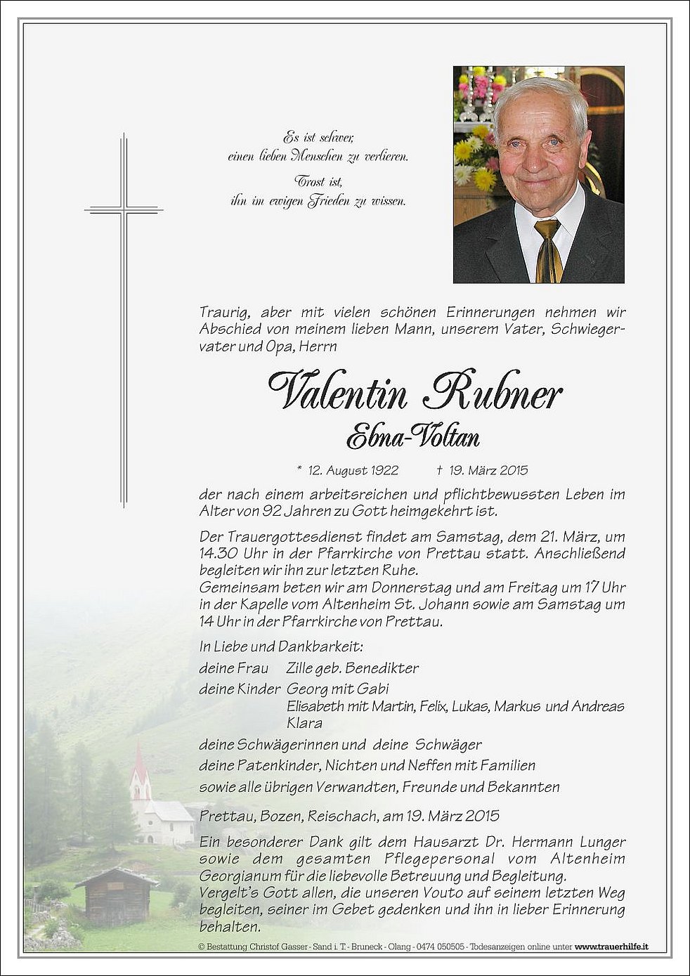 Der Trauergottesdienst findet am Samstag, dem 21. März, um 14.30 Uhr in der Pfarrkirche von Prettau statt. Anschließend begleiten wir ihn zur letzten Ruhe.