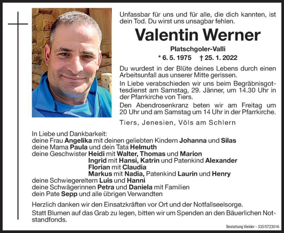 Statt Blumen auf das Grab zu legen, bitten wir um Spenden an den Bäuerlichen Notstandfonds - Kennwort Familie Valentin Werner.