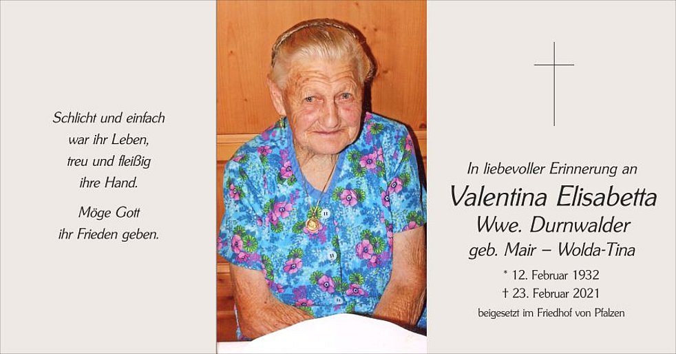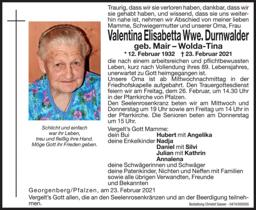 Den Trauergottesdienst feiern wir am Freitag, dem 26. Februar, um 14.30 Uhr in der Pfarrkirche von Pfalzen.