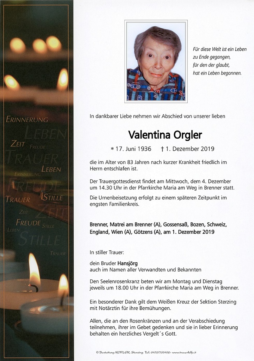 Der Trauergottesdienst findet am Mittwoch, dem 4. Dezember um 14.30 Uhr in der Pfarrkirche Maria am Weg in Brenner statt.