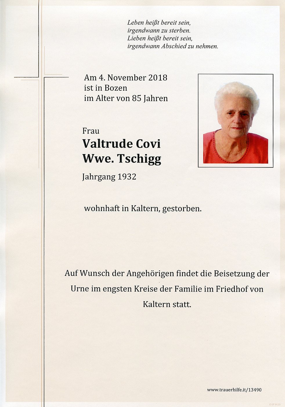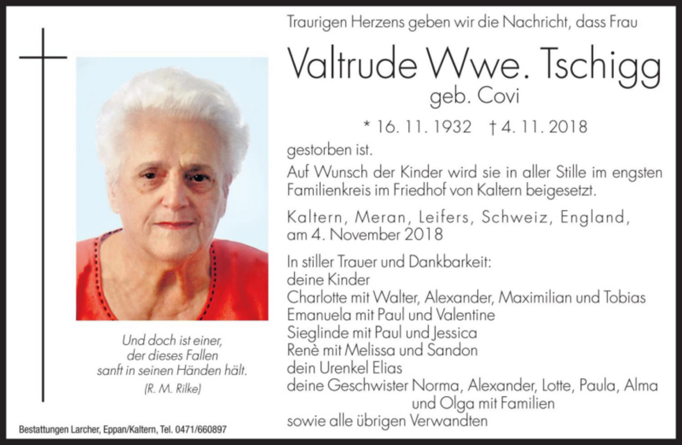 Auf Wunsch der Kinder wird sie in aller Stille im engsten Familienkreis im Friedhof von Kaltern beigesetzt.