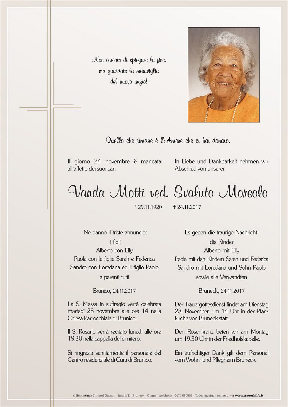 Der Trauergottesdienst findet am Dienstag 28. November, um 14 Uhr in der Pfarr-kirche von Bruneck statt.