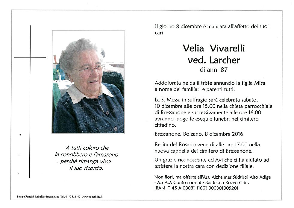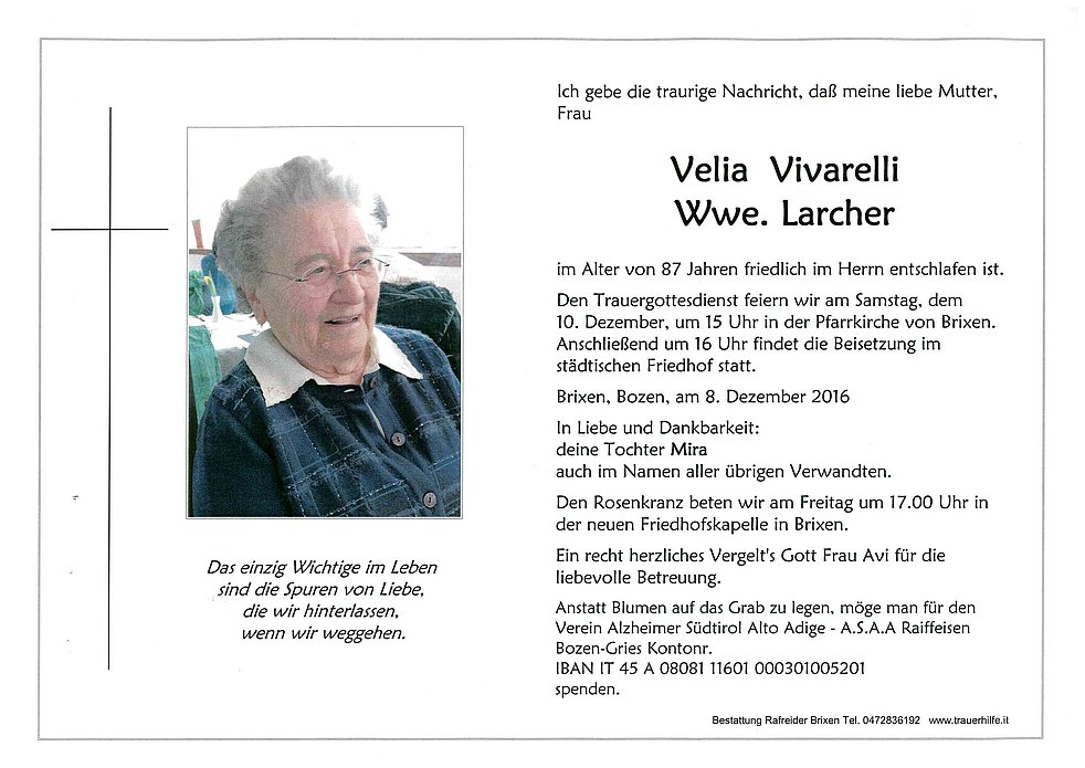 Anstatt Blumen auf das Grab zu legen, möge man für den Verein Alzheimer Südtirol Alto Adige - A.S.A.A Raiffeisen Bozen-Gries Kontonr. IBAN IT 45 A 08081 11601 000301005201 spenden.