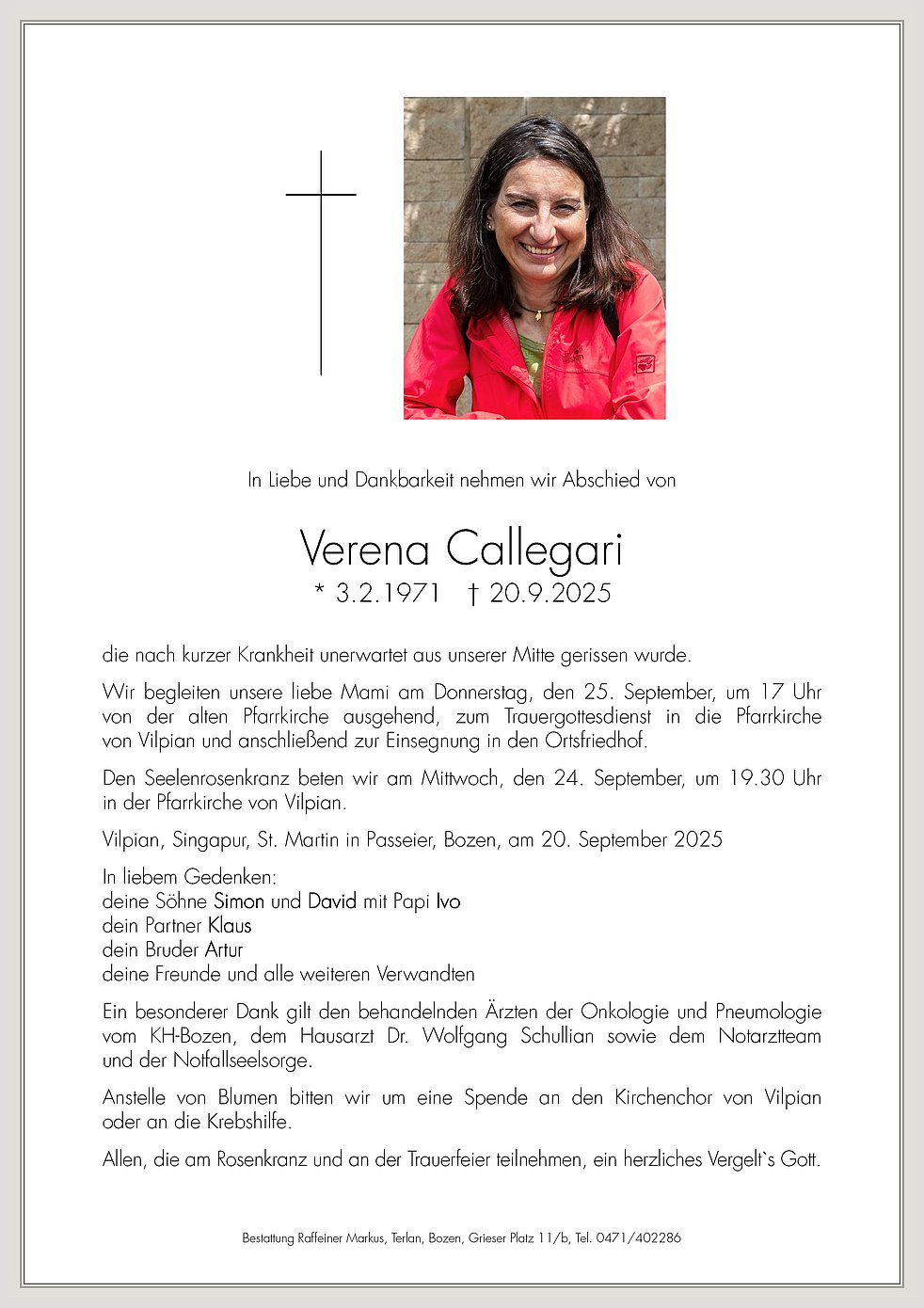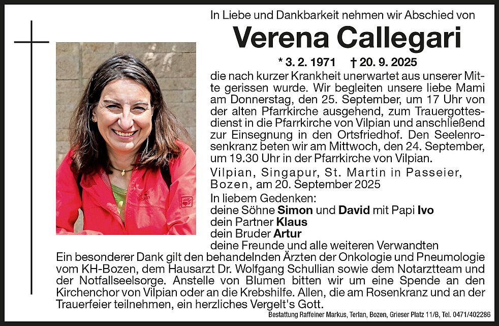 Wir begleiten unsere liebe Mami am Donnerstag, den 25. September, um 17 Uhr von der alten Pfarrkirche ausgehend, zum Trauergottesdienst in die Pfarrkirche von Vilpian und anschließend zur Einsegnung in den Ortsfriedhof.