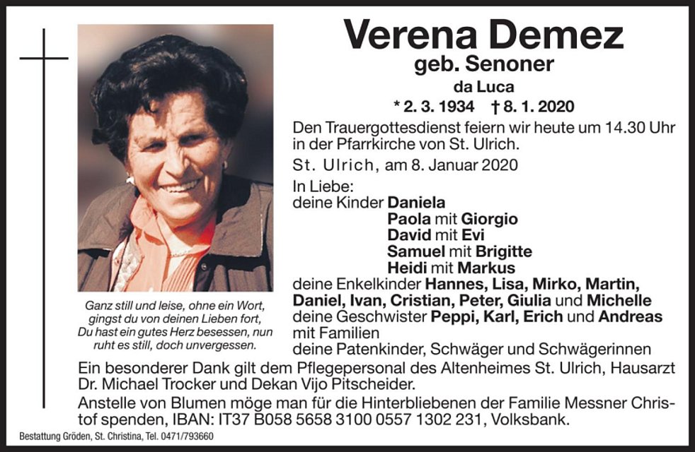 Ein besonderer Dank gilt dem Pflegepersonal des Altenheimes St. Ulrich, Hausarzt Dr. Michael Trocker und Dekan Vijo Pitscheider.