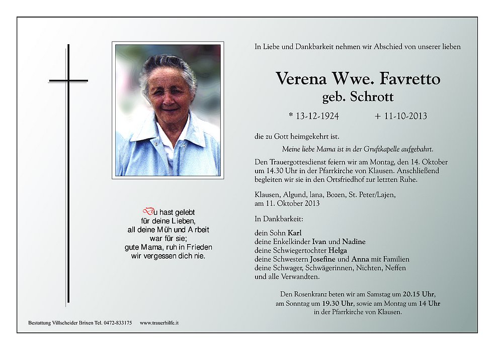 um 14.30 Uhr in der Pfarrkirche von Klausen. Anschließend begleiten wir sie in den Ortsfriedhof zur letzten Ruhe.