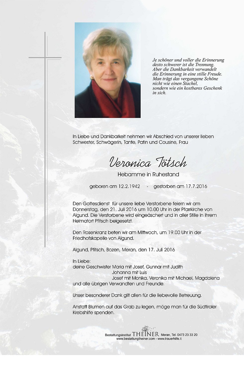 Algund. Die Verstorbene wird eingeäschert und in aller Stille in ihrem