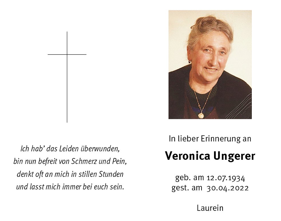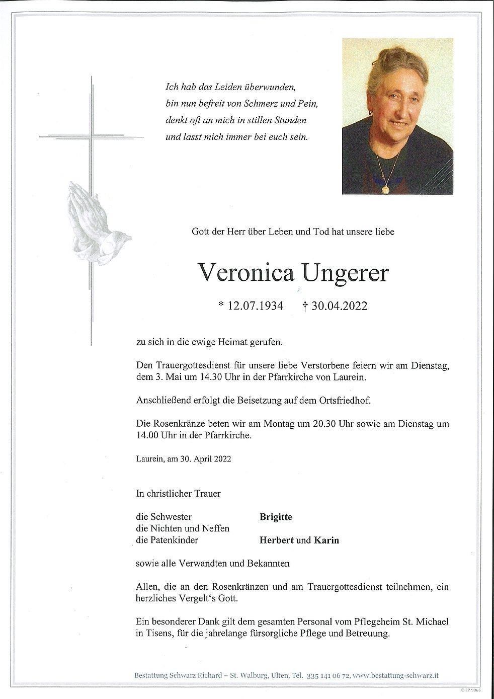 Den Trauergottesdienst für unsere liebe Verstorbene feiern wir am Dienstag, dem 3. Mai um 14.30 Uhr in der Pfarrkirche von Laurein.