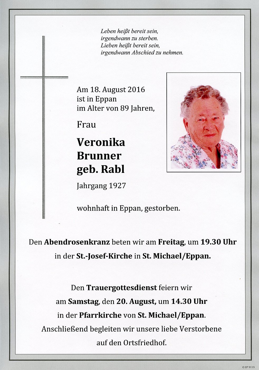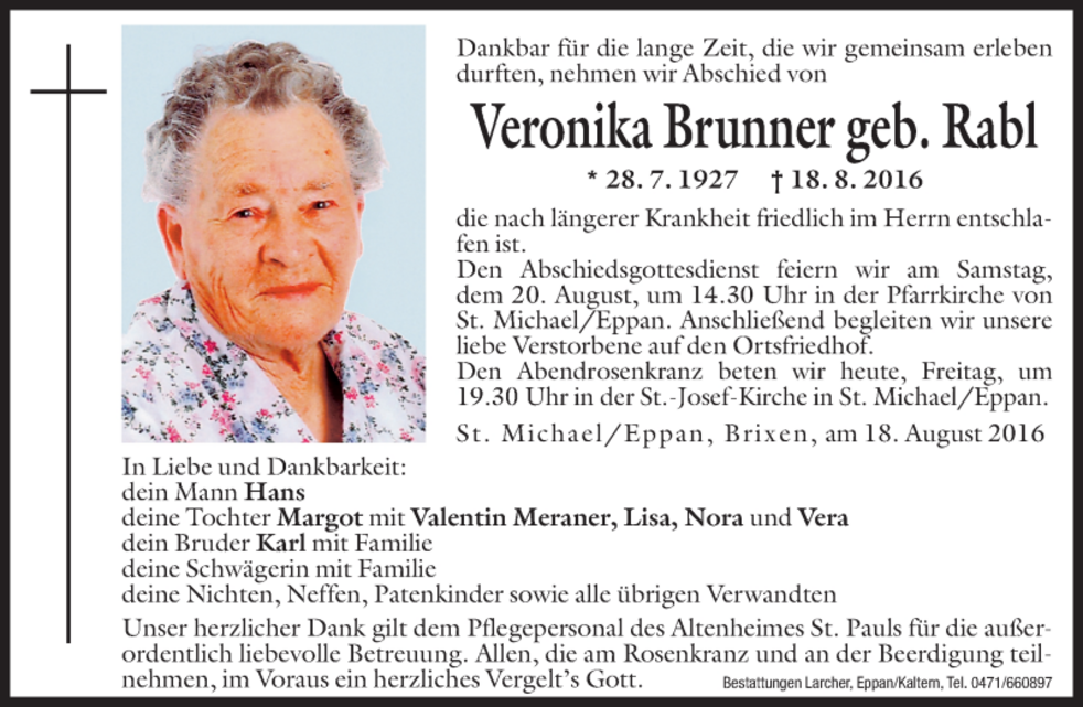 Den Abschiedsgottesdienst feiern wir am Samstag, dem 20. August um 14.30 Uhr in der Pfarrkirche von St. Michael/Eppan. Anschließend begleiten wir unsere liebe Verstorbene auf den Ortsfriedhof.