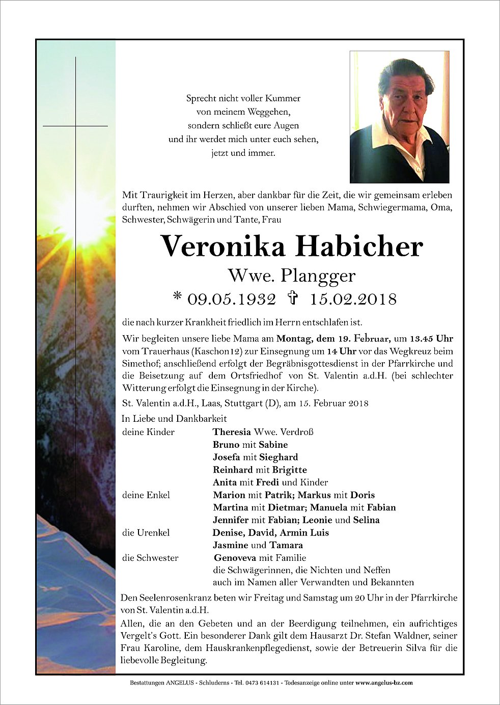 Wir begleiten unsere liebe Mama am Montag, dem 19. Februar, um 13.45 Uhr vom Trauerhaus (Kaschon12) zur Einsegnung um 14 Uhr vor das Wegkreuz beim Simethof; anschließend erfolgt der Begräbnisgottesdienst in der Pfarrkirche und die Beisetzung auf dem Ortsfriedhof von St. Valentin a.d.H. (bei schlechter Witterung erfolgt die Einsegnung in der Kirche).