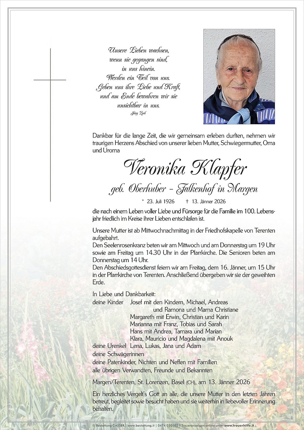 Ein herzliches Vergelt’s Gott an alle, die unsere Mutter in den letzten Jahren betreut, begleitet sowie besucht haben und sie weiterhin in liebevoller Erinnerung behalten.