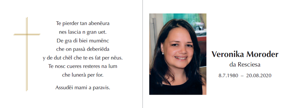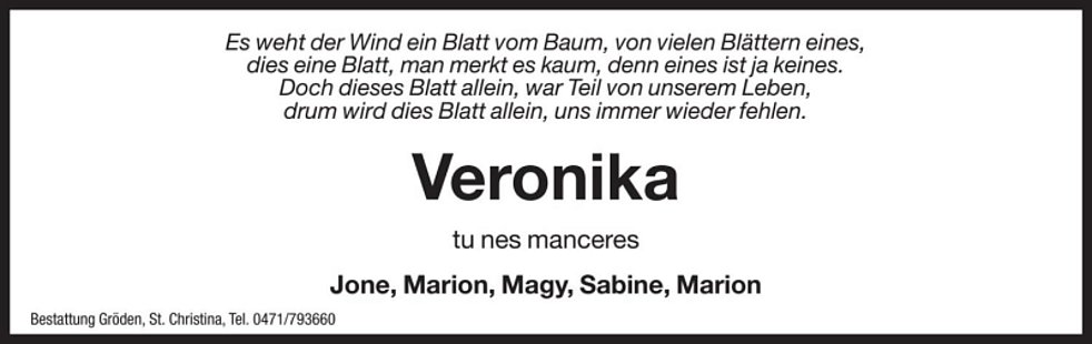 Der Trauergottesdienst für unsere liebe Veronika findet am Samstag, dem 22. August, um 14.30 Uhr in der Pfarrkirche von Wolkenstein statt.