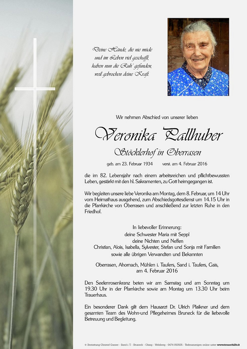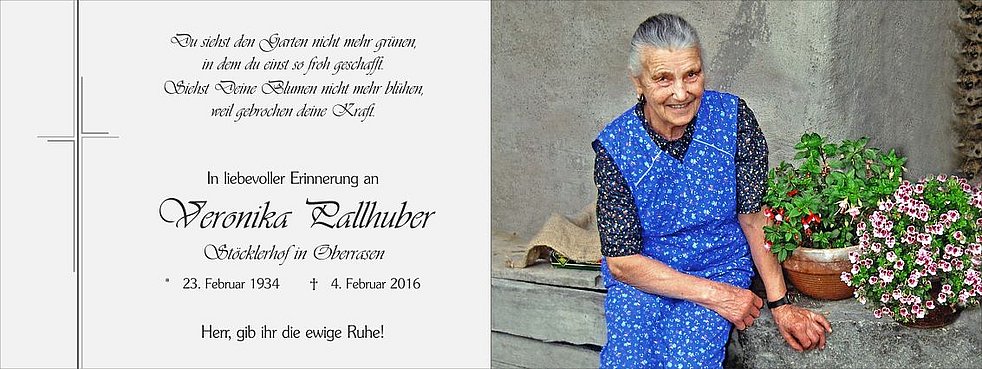 Wir begleiten unsere liebe Veronika am Montag, dem 8. Februar, um 14 Uhr vom Heimathaus ausgehend, zum Abschiedsgottesdienst um 14.15 Uhr in die Pfarrkirche von Oberrasen und anschließend zur letzten Ruhe in den Friedhof.