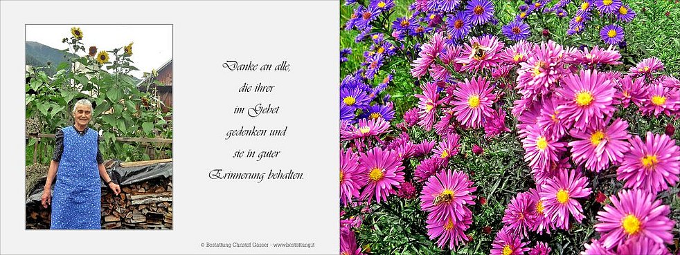 Ein besonderer Dank gilt dem Hausarzt Dr. Ulrich Plaikner und dem gesamten Team des Wohn-und Pflegeheimes Bruneck für die liebevolle Betreuung und Begleitung.