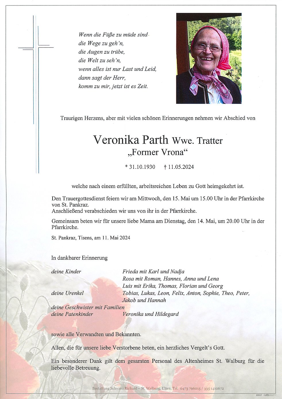 Den Trauergottesdienst feiern wir am Mittwoch, den 15. Mai um 15.00 Uhr in der Pfarrkirche von St. Pankraz.
