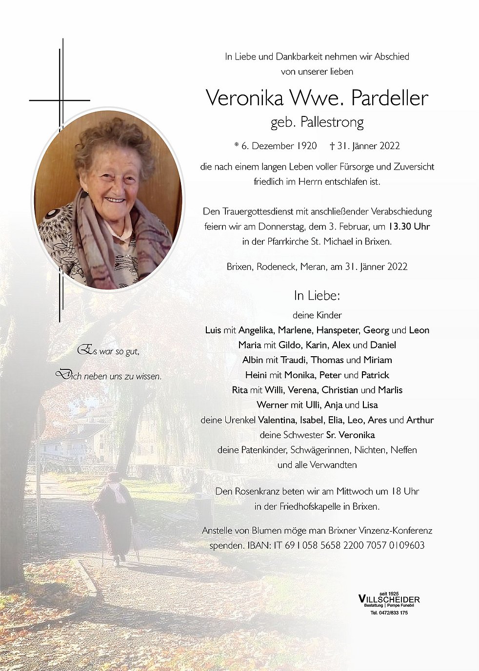 In stiller Trauer gedenken wir der Tante Veronika, möge sie ruhen in Frieden bei Gott! Fam. Giovanni und Maria Gasser, Stern/La Ila