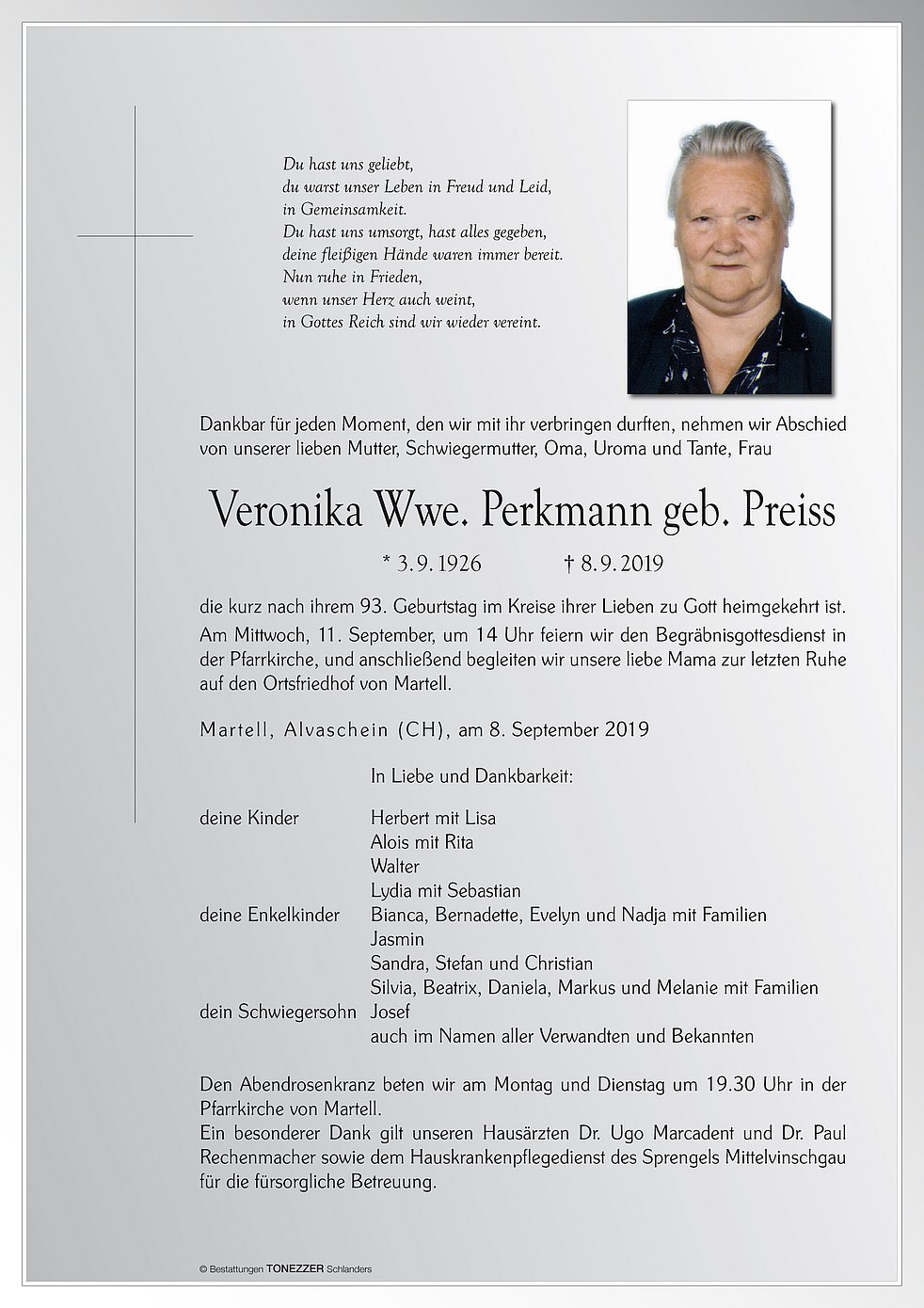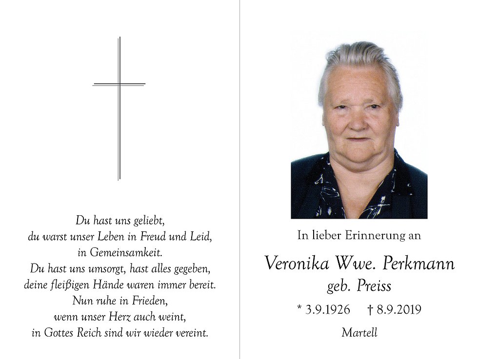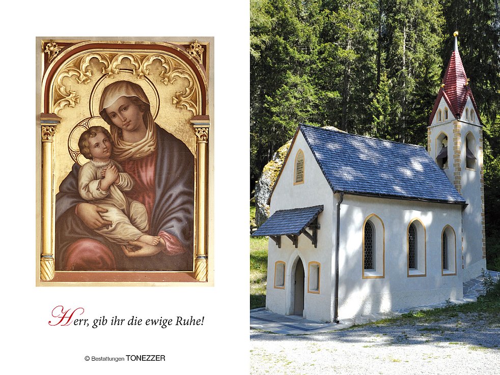 Am Mittwoch, 11. September, um 14 Uhr feiern wir den Begräbnisgottesdienst in der Pfarrkirche, und anschließend begleiten wir unsere liebe Mama zur letzten Ruhe auf den Ortsfriedhof von Martell.