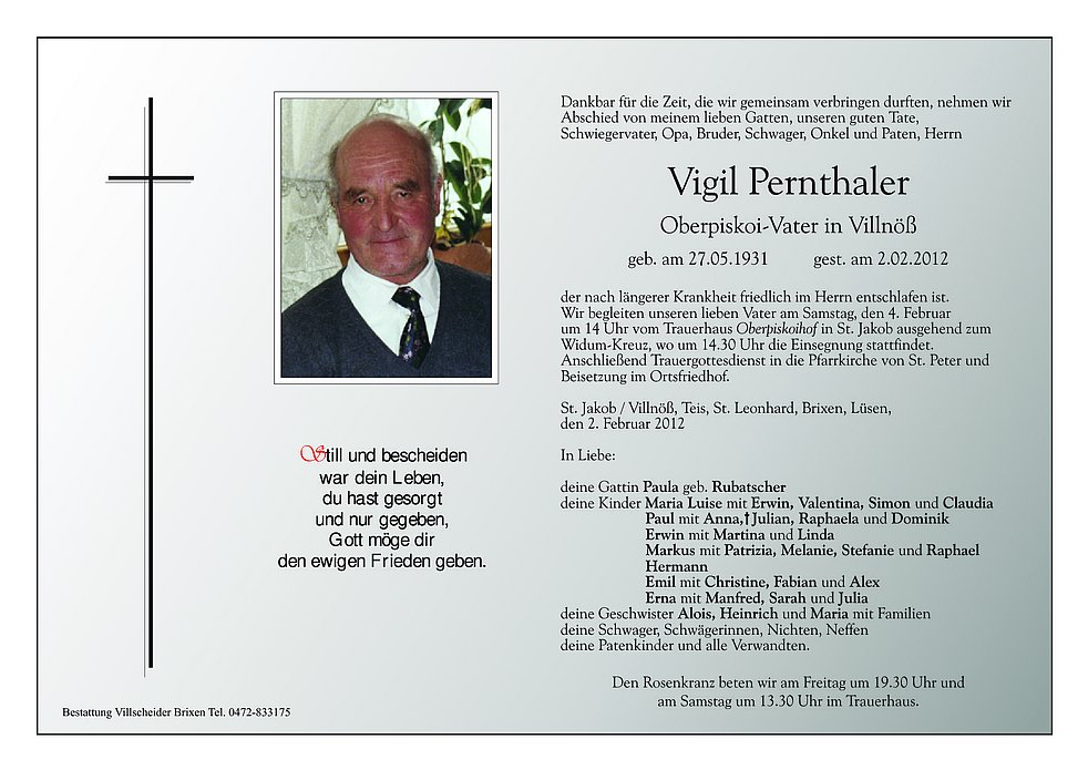 Liebe Familie Pernthaler, ich nehme aufrichtig Anteil am Ableben Deines Mannes, Eures Vaters und Opa;