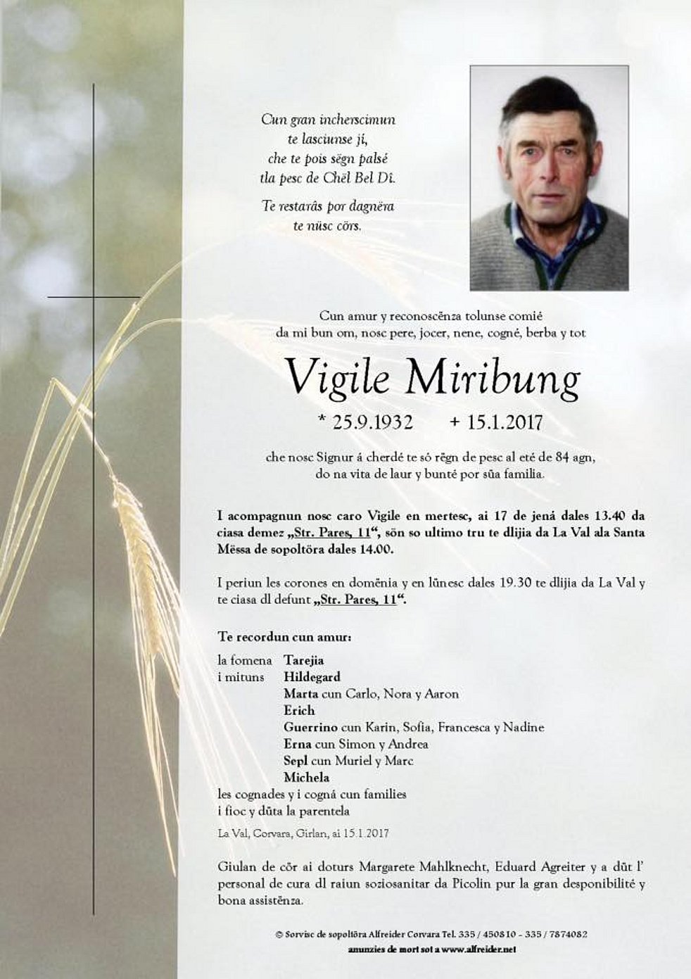 Gemeinsam begleiten wir unseren lieben Vigile am Dienstag, dem 17. Jänner, um 13.40 Uhr vom Trauerhaus „Str. Pares, 11“ ausgehend, zum Abschiedsgottesdienst um 14 Uhr in die Pfarrkirche von La Val/Wengen.