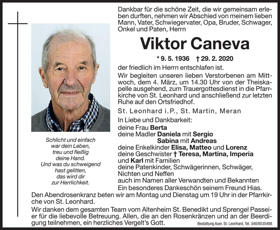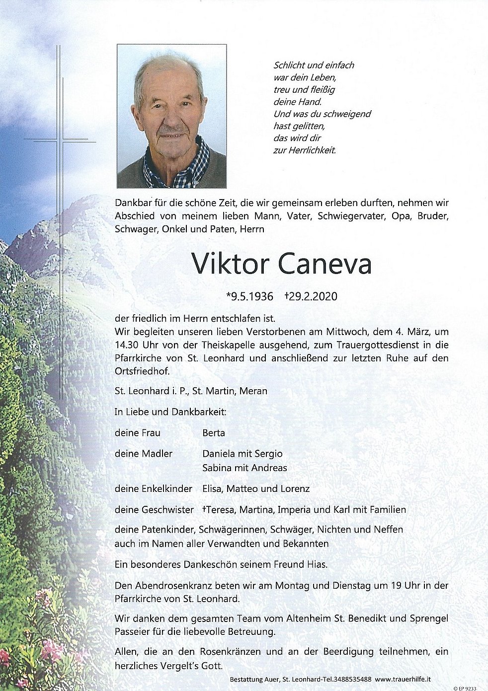 Wir begleiten unseren lieben Verstorbenen am Mittwoch, dem 4. März, um 14.30 Uhr von der Theiskapelle ausgehend, zum Trauergottesdienst in die Pfarrkirche von St. Leonhard und anschließend zur letzten Ruhe auf den Ortsfriedhof.