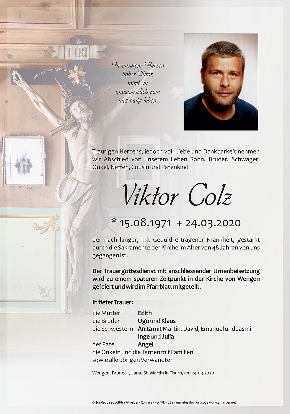 Der Trauergottesdienst mit anschliessender Urnenbeisetzung wird zu einem späteren Zeitpunkt in der Kirche von Wengen gefeiert und wird im Pfarrblatt mitgeteilt.