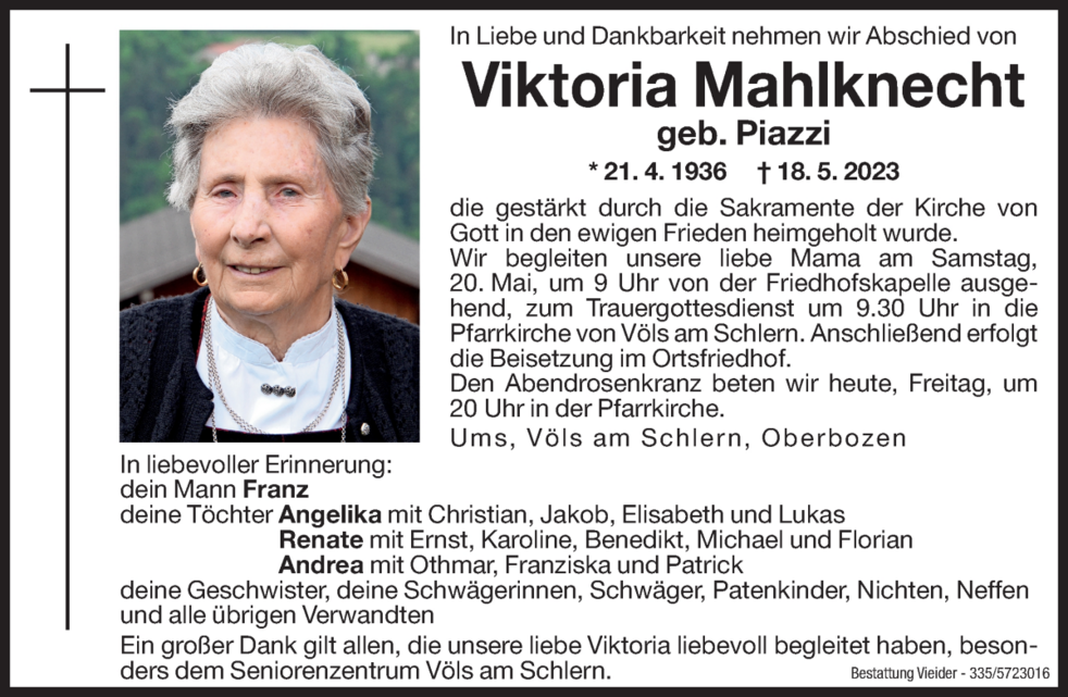 Wir begleiten unsere liebe Mama am Samstag, 20. Mai, um 9 Uhr von der Friedhofskapelle ausgehend, zum Trauergottesdienst um 9.30 Uhr in die Pfarrkirche von Völs am Schlern. Anschließend erfolgt die Beisetzung im Ortsfriedhof.