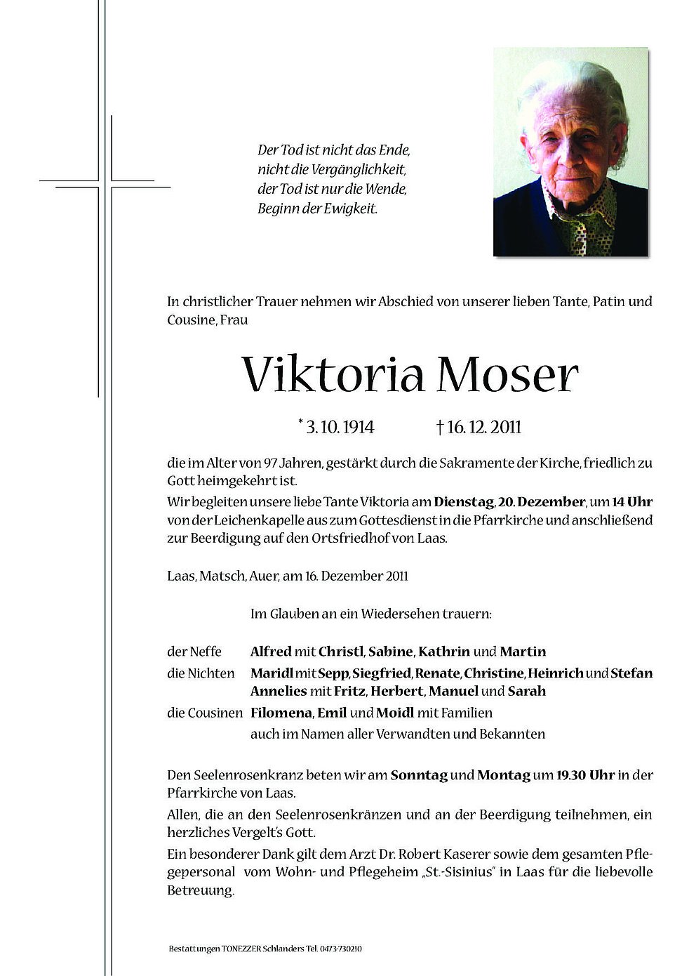 Wir begleiten unsere liebe Tante Viktoria am Dienstag, 20. Dezember, um 14 Uhr von der Leichenkapelle aus zum Gottesdienst in die Pfarrkirche und anschließend zur Beerdigung auf den Ortsfriedhof von Laas.