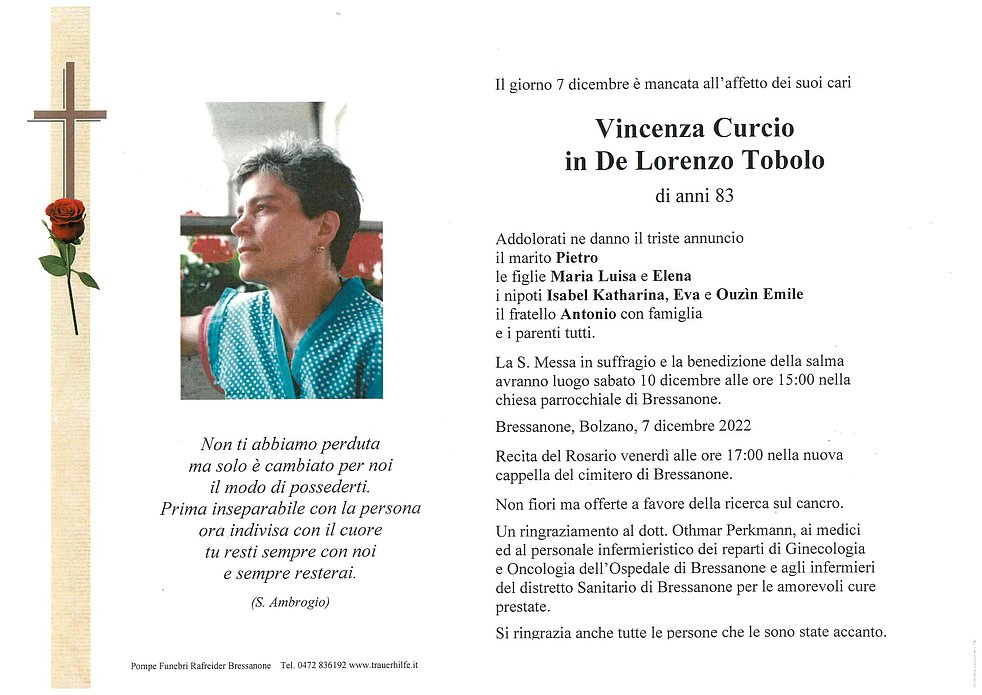 La S. Messa in suffragio e la benedizione della salma avranno luogo sabato 10 dicembre alle ore 15:00 nella chiesa parrocchiale di Bressanone.