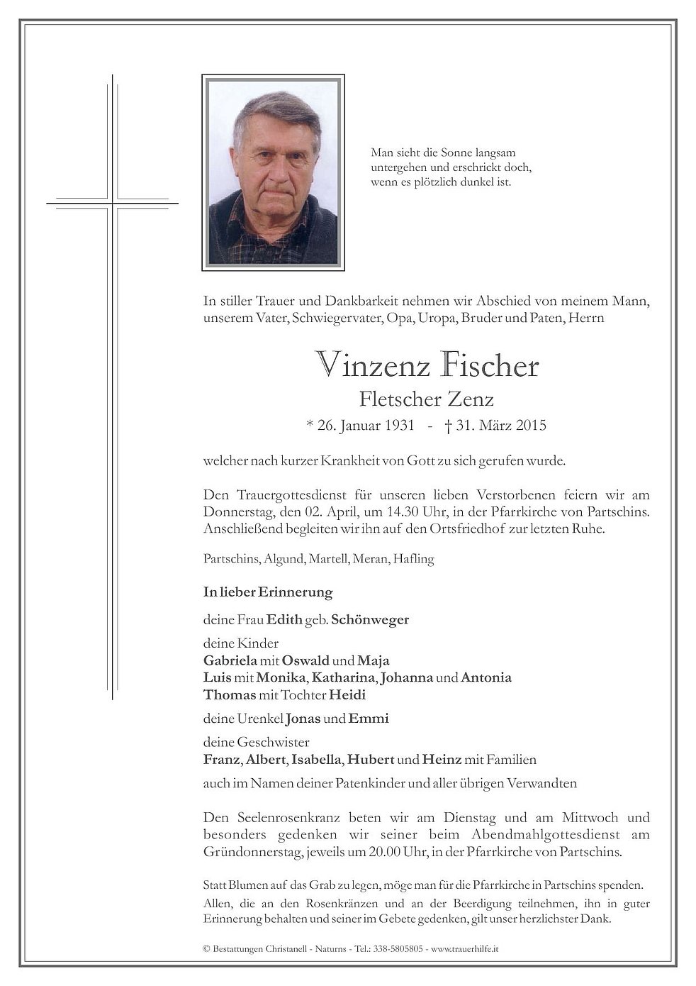 Den Trauergottesdienst für unseren lieben Verstorbenen feiern wir am Donnerstag, den 02. April, um 14.30 Uhr, in der Pfarrkirche von Partschins. Anschließend begleiten wir ihn auf den Ortsfriedhof zur letzten Ruhe.