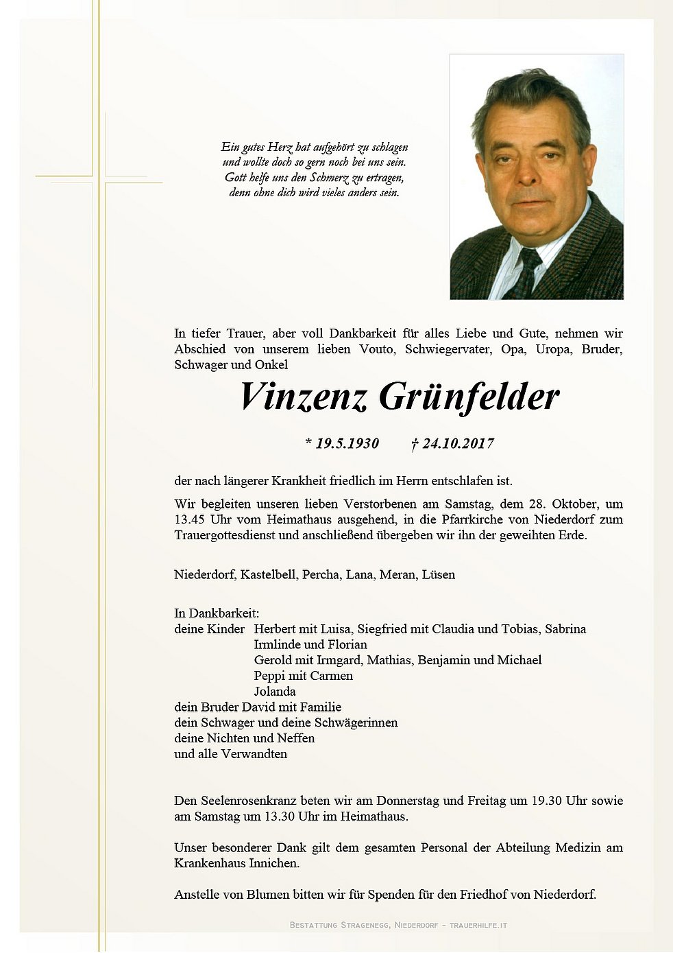 Wir begleiten unseren lieben Verstorbenen am Samstag, dem 28. Oktober, um 13.45 Uhr vom Heimathaus ausgehend, in die Pfarrkirche von Niederdorf zum Trauergottesdienst und anschließend übergeben wir ihn der geweihten Erde.