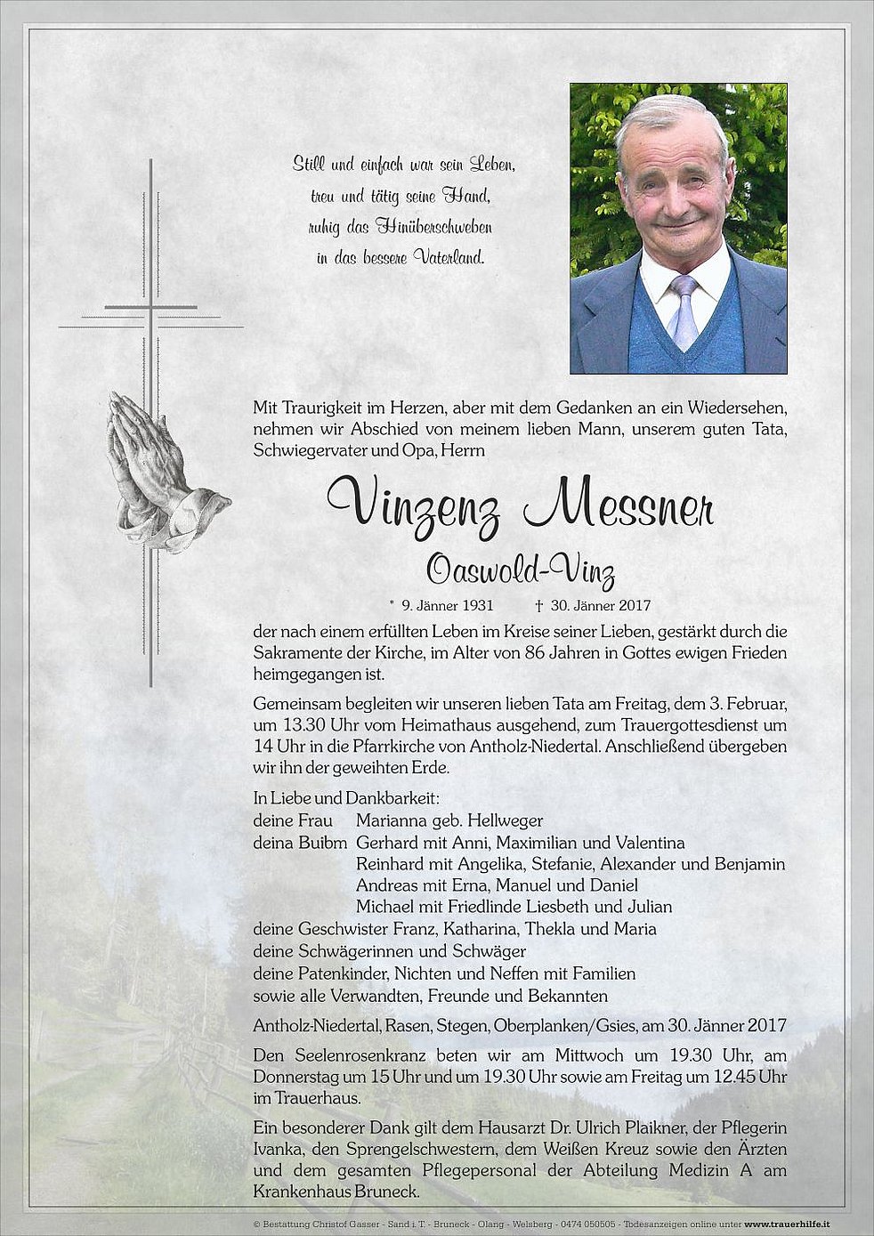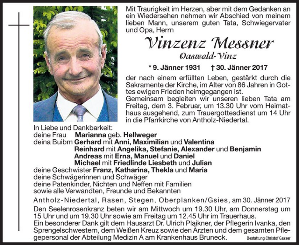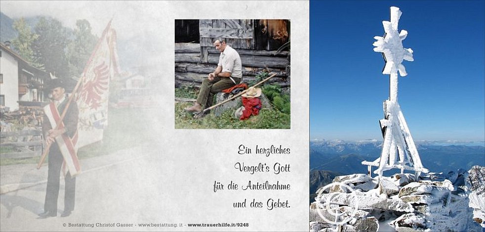 Gemeinsam begleiten wir unseren lieben Tata am Freitag, dem 3. Februar, um 13.30 Uhr vom Heimathaus ausgehend, zum Trauergottesdienst um 14 Uhr in die Pfarrkirche von Antholz-Niedertal. Anschließend übergeben wir ihn der geweihten Erde.
