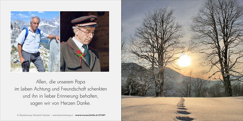 Ein Dank gilt den Hausärzten Frau Dr. Berta Marcher und Herrn Dr. Johann Hainz sowie dem gesamten Team der Abteilung Langzeitpflege vom Wohn- und Pflegeheim Bruneck für die liebevolle Betreuung.