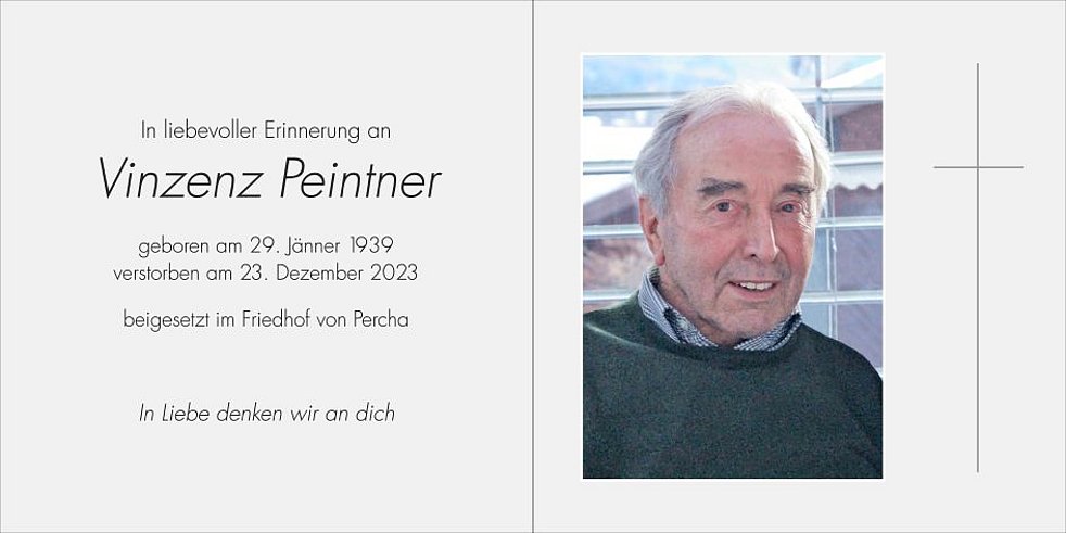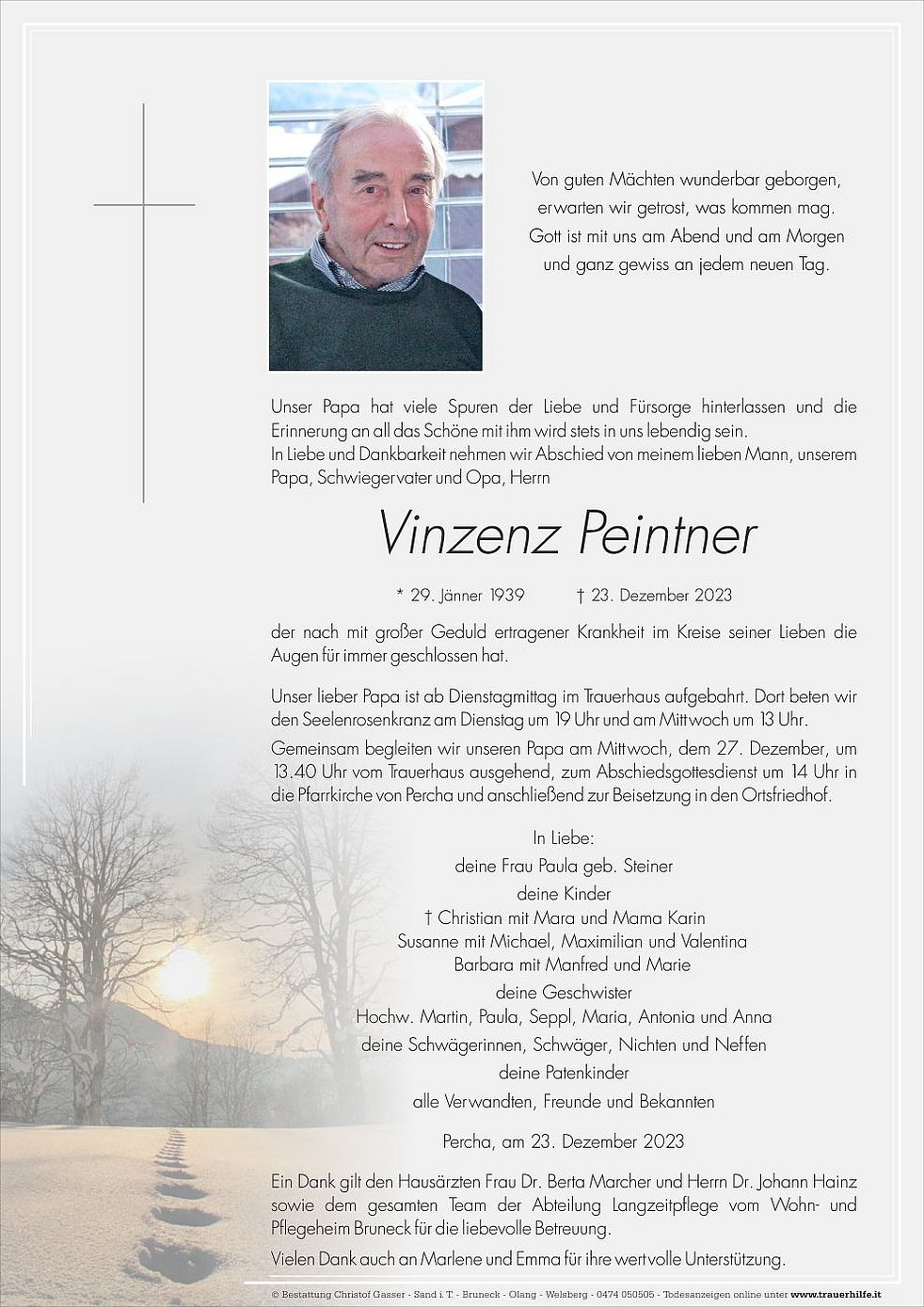 Gemeinsam begleiten wir unseren Papa am Mittwoch, dem 27. Dezember, um 13.40 Uhr vom Trauerhaus ausgehend, zum Abschiedsgottesdienst um 14 Uhr in die Pfarrkirche von Percha und anschließend zur Beisetzung in den Ortsfriedhof.