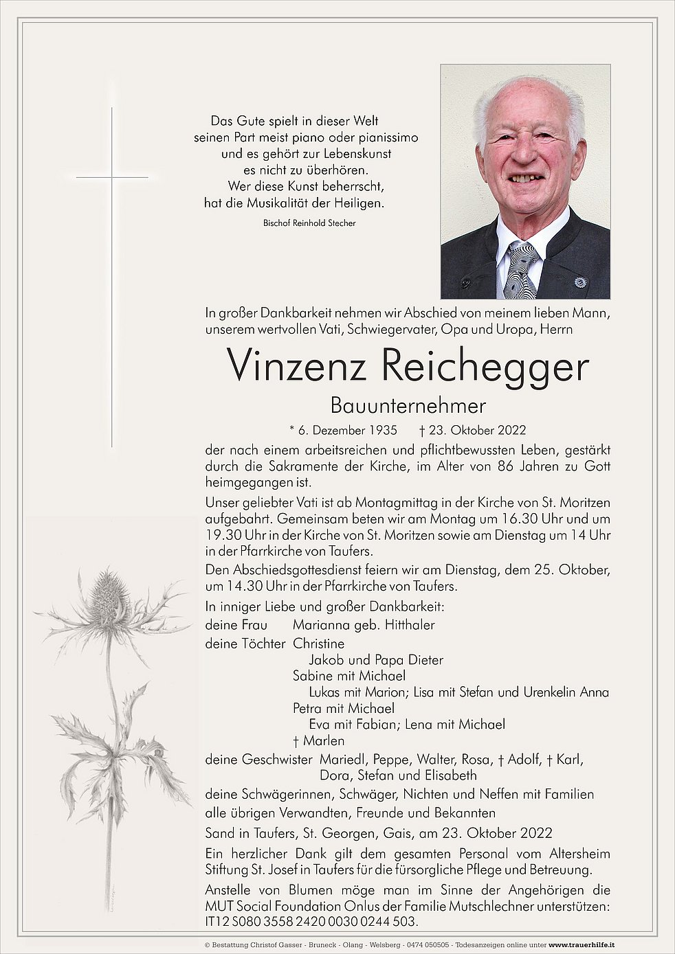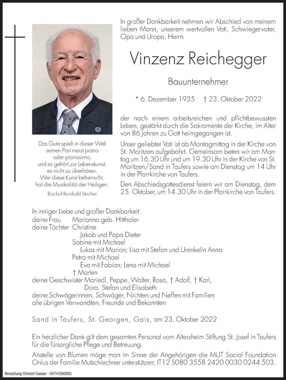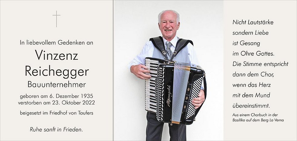 Vinzenz Reichegger errichtete sein Lebensgebäude auf einem tief gegründeten Fundament der Menschenwerte, gestellt auf stabile, tragende Säulen,