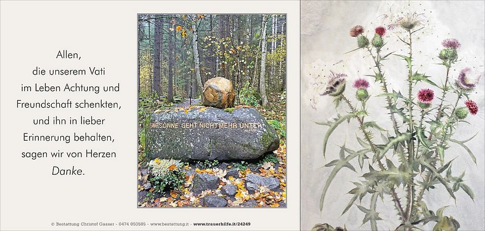 Anstelle von Blumen möge man im Sinne der Angehörigen die MUT Social Foundation Onlus der Familie Mutschlechner unterstützen: IT12 S080 3558 2420 0030 0244 503.
