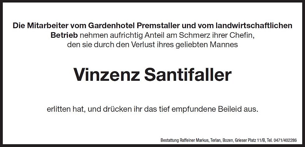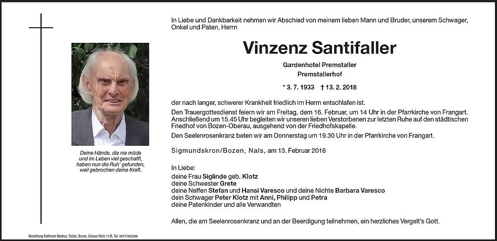 Den Trauergottesdienst feiern wir am Freitag, dem 16. Februar, um 14 Uhr in der Pfarrkirche von Frangart. Anschlieβend um 15.45 Uhr begleiten wir unseren lieben Verstorbenen zur letzten Ruhe auf den städtischen Friedhof von Bozen-Oberau, ausgehend von der Friedhofskapelle.