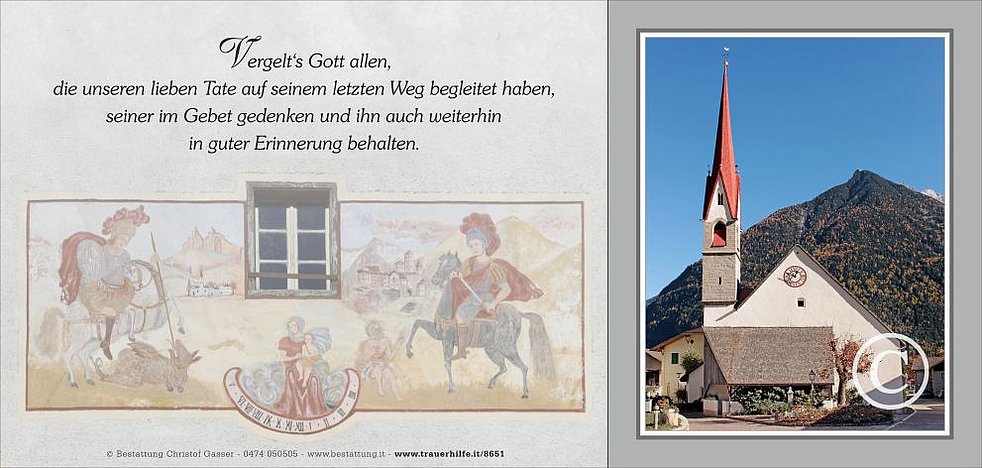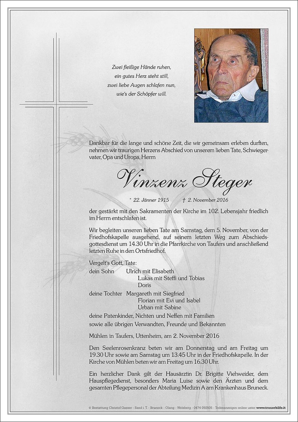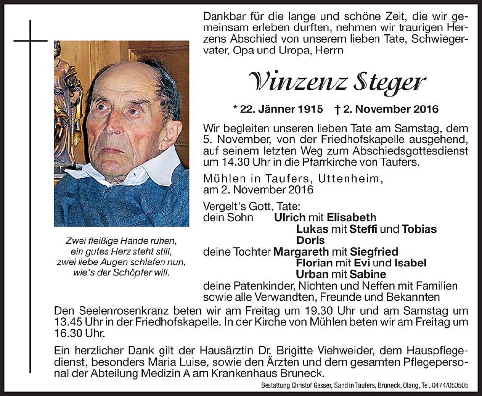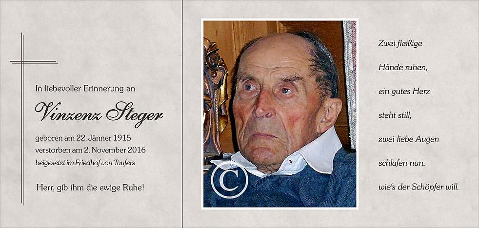 Wir begleiten unseren lieben Tate am Samstag, dem 5. November, von der Friedhofskapelle ausgehend, auf seinem letzten Weg zum Abschiedsgottesdienst um 14.30 Uhr in die Pfarrkirche von Taufers und anschließend letzten Ruhe in den Ortsfriedhof.