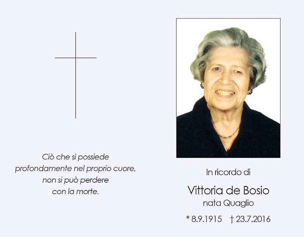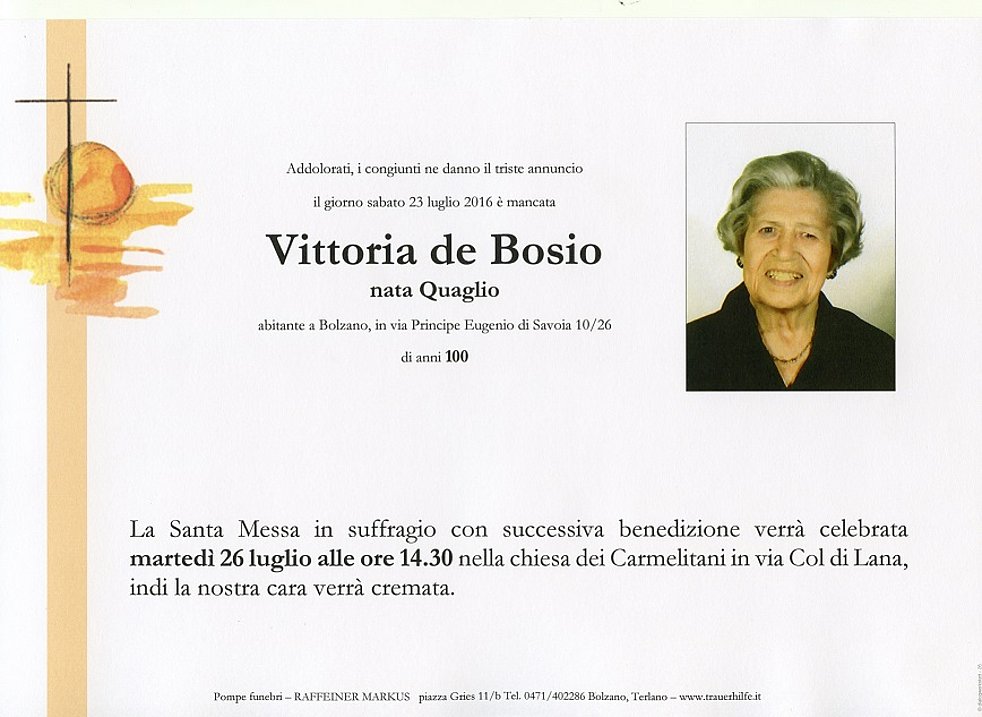 La S. Messa in suffragio verrà celebrata martedì 26 luglio alle ore 14.30 nella chiesa dei Carmelitani in via Col di Lana, indi la nostra cara verrà cremata.