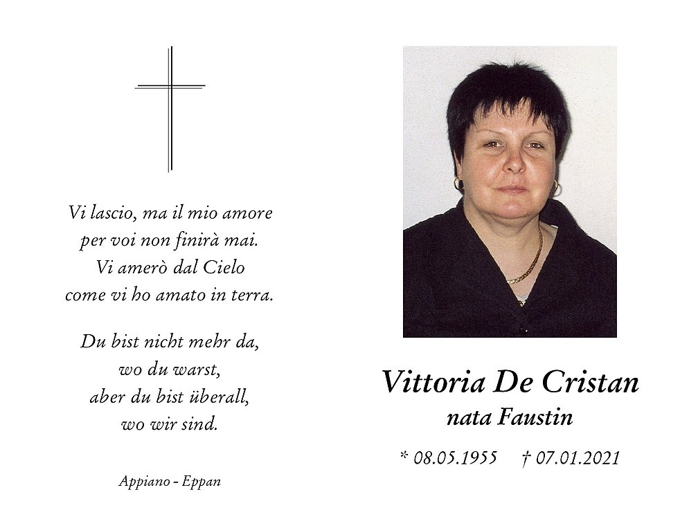 Liebe Viktoria danke dass Du unsere Tante warst. Wir haben viele schöne Erinnerungen an Dich, die wir nie mehr missen möchten. Auch wenn Du nun von dieser Welt gegangen bist, in unseren Gedanken lebst Du weiter. Wie gern fuhren wir zu Dir und hatten schon grosse Vorfreude darauf, doch nun musstest Du gehen, weil der Herr sprach Deine Zeit ist gekommen um für immer zu gehen. Mögen Engel Dich ins Paradiese geleiten. Danke Fi olls.