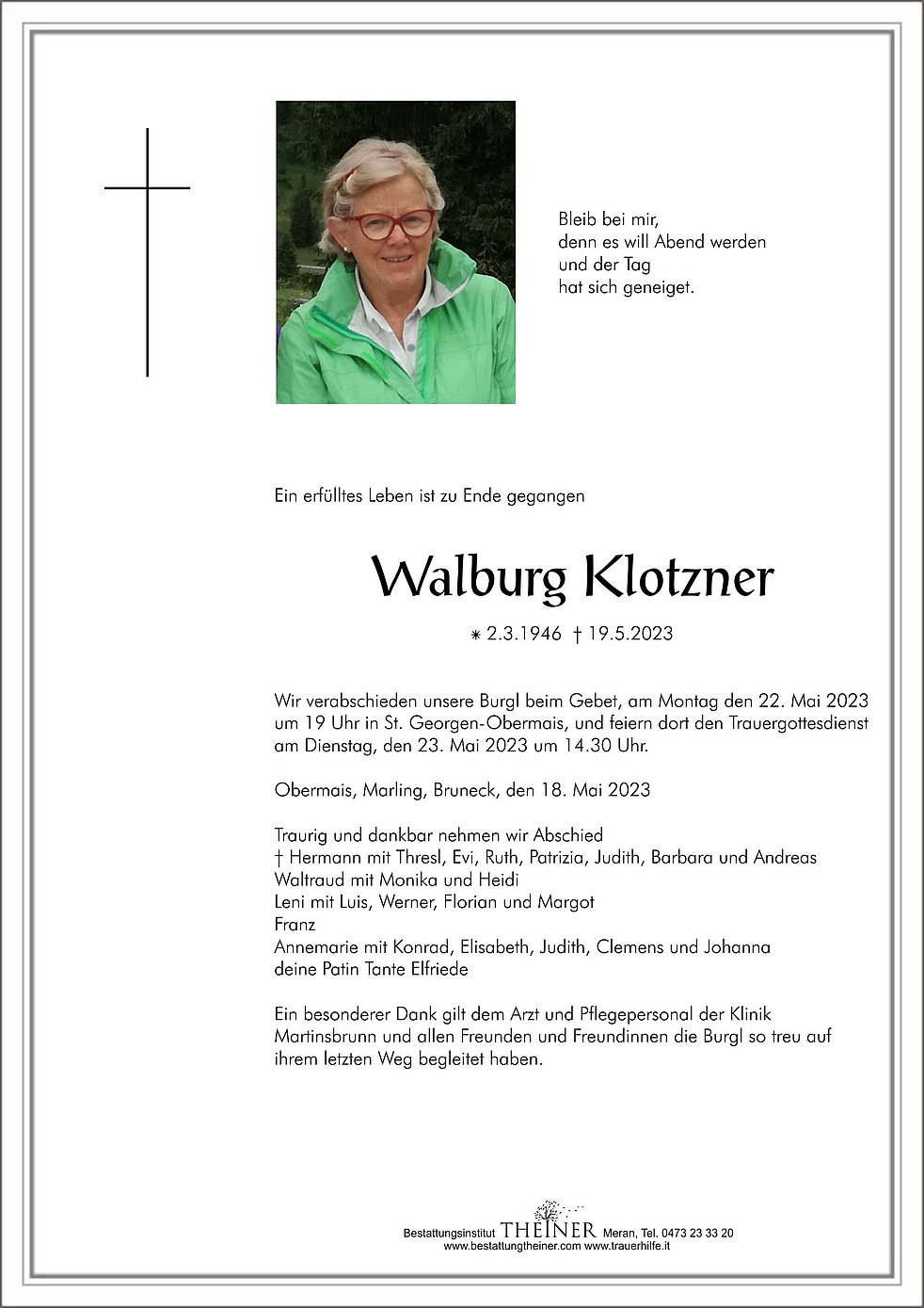 Wir verabschieden unsere Burgl beim Gebet, am Montag den 22. Mai 2023 um 19 Uhr in St. Georgen-Obermais, und feiern dort den Trauergottesdienst am Dienstag, den 23. Mai 2023 um 14.30 Uhr.