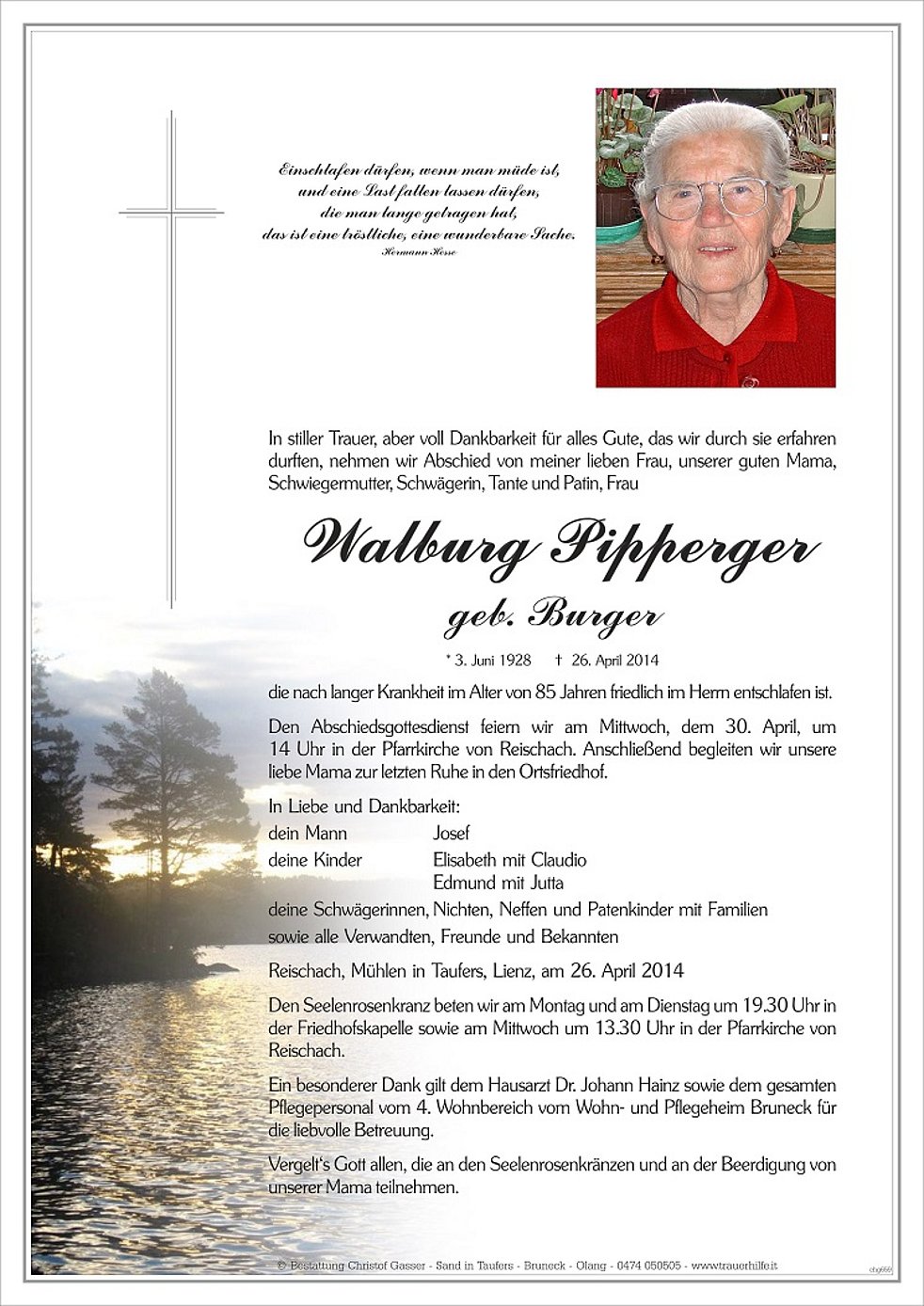 Ein besonderer Dank gilt dem Hausarzt Dr. Johann Hainz sowie dem gesamten Pflegepersonal vom 4. Wohnbereich vom Wohn- und Pflegeheim Bruneck für die liebvolle Betreuung.