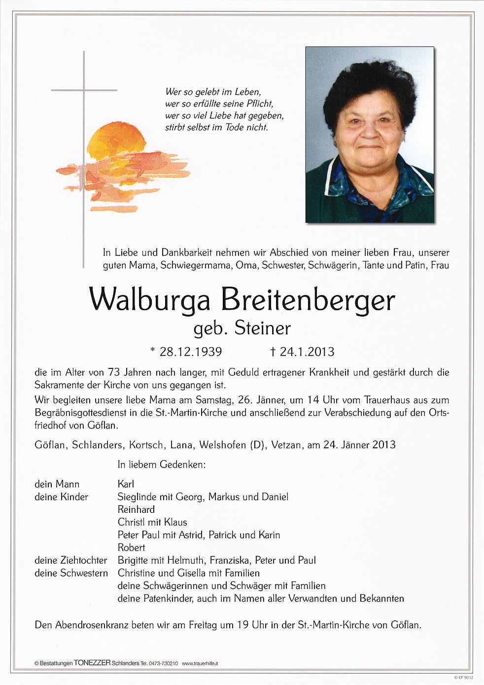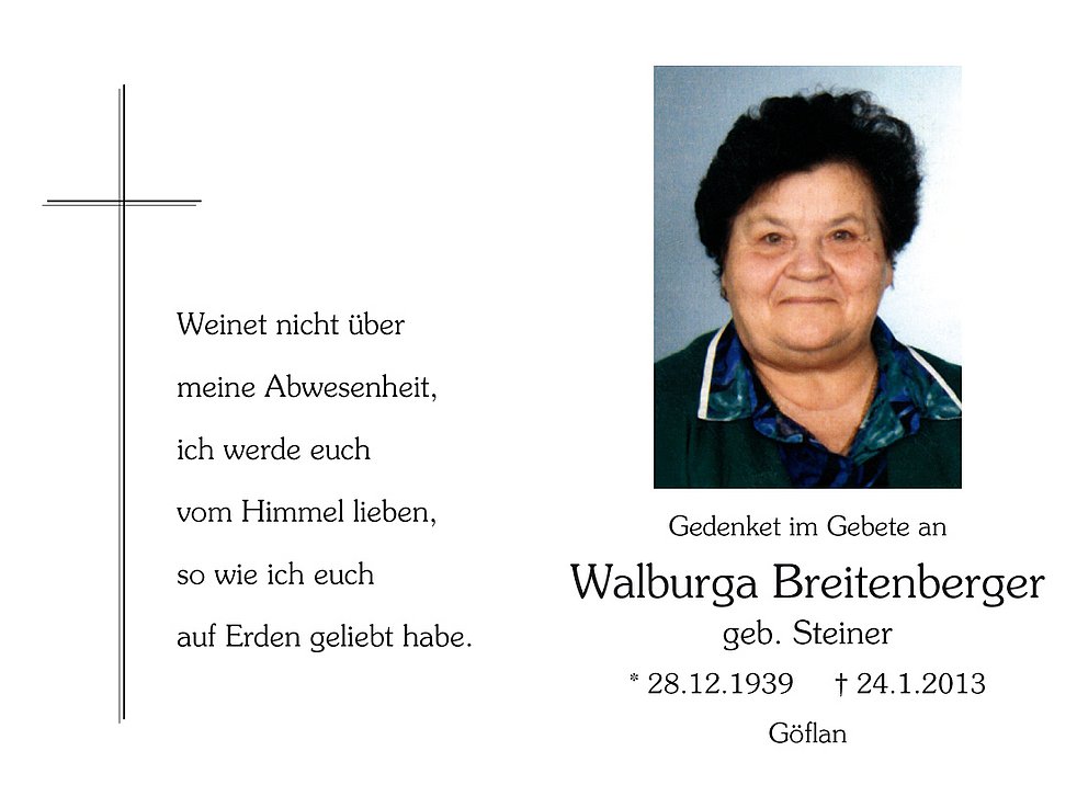 Wir begleiten unsere liebe Mama am Samstag, 26. Jänner, um 14 Uhr vom Trauerhaus aus zum Begräbnisgottesdienst in die St.-Martin-Kirche und anschließend zur Verabschiedung auf den Ortsfriedhof von Göflan.