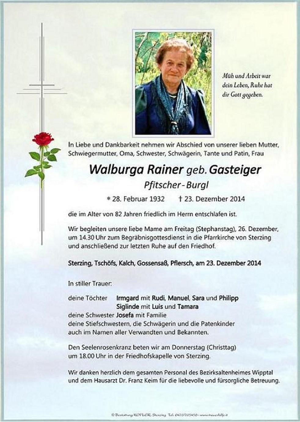 um 14.30 Uhr zum Begräbnisgottesdienst in die Pfarrkirche von Sterzing